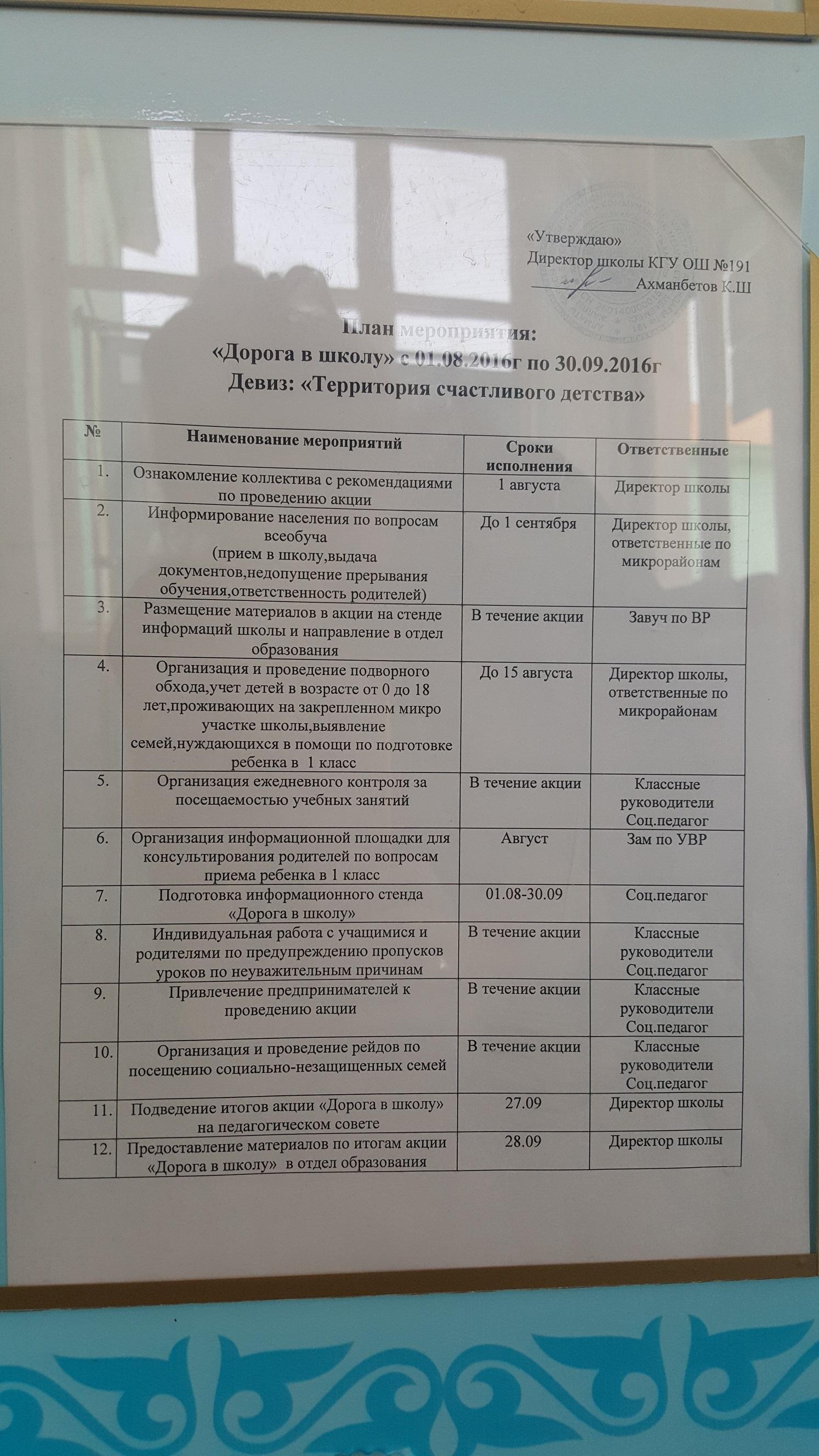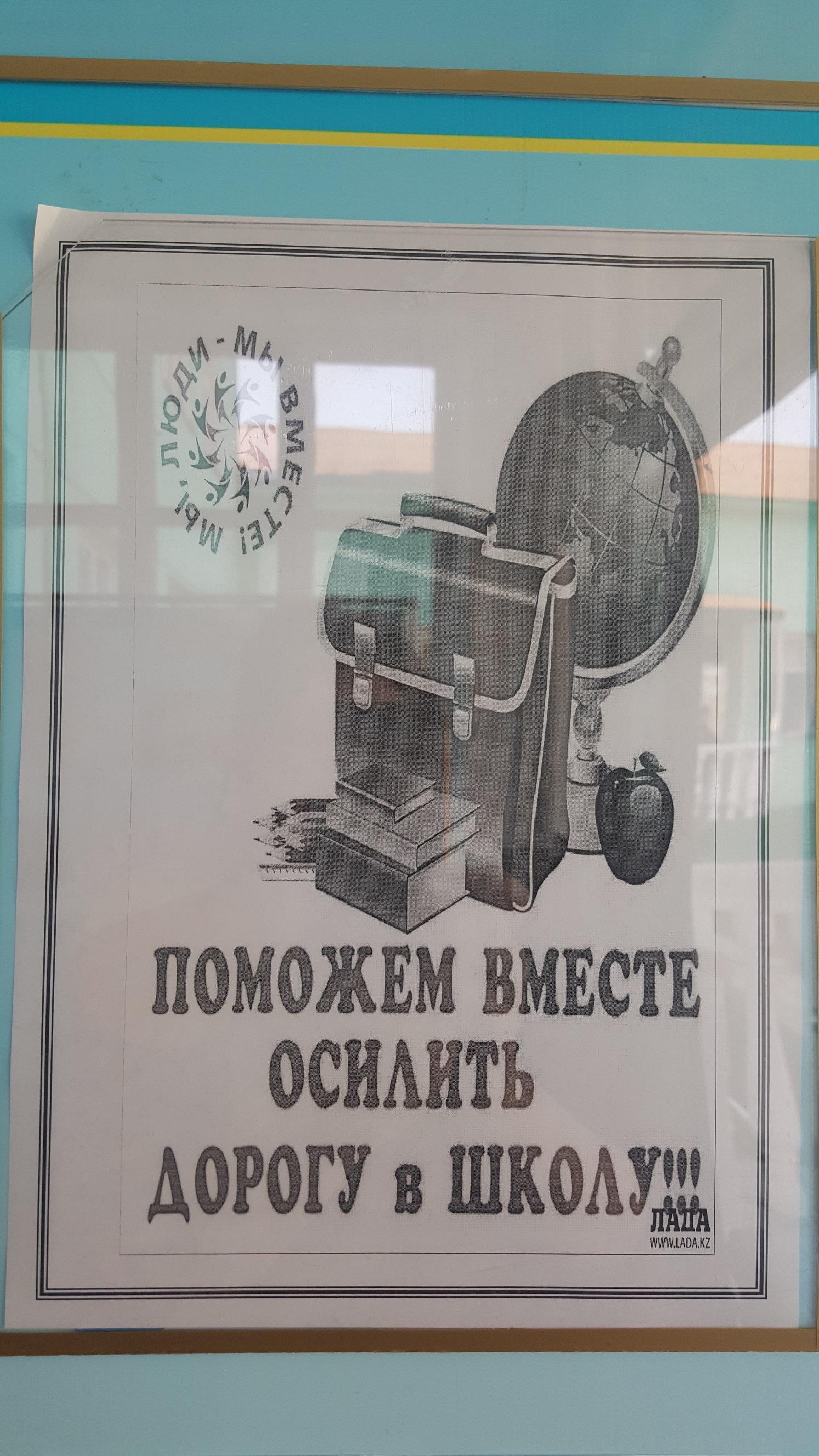 С периода 1 августа по 30 сентября проводилась Республиканская акция "Дорога в школу" под девизом "Территория счастливого детства!" целью акций было то что бы оказать материальную помощь семьям из социально риска. Были проведены 10 поквартирных обходов, было задействовано 10 учителей, родительская общественность. За данный период прошло 7 рейдов. а так же была оказана помощь в виде школьной формы, канцтоваров 13 школьникам из малообеспеченных семей. Спонсорскую помощь оказали Бостандыкский Акимат, ТЦ "Мега" общая сумма составила 140 тысяч тенге. Все вопросы по организации и проведению акции "Дорога в школу" рассматривались на совещаниях при директоре, административных совещаниях.