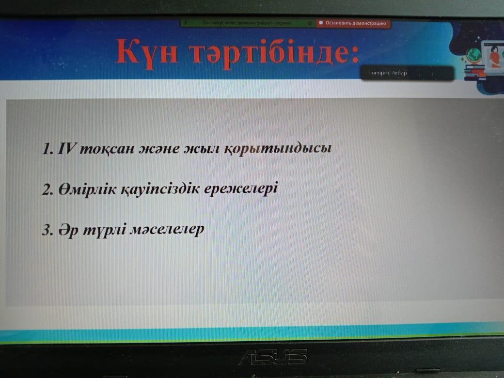 Онлайн-кездесудің күн тәртібі негізінде мектебіміздің директоры А.С. Нургалиева ашып берді. Күн тәртібінде 3 мәселе қарастырылды: