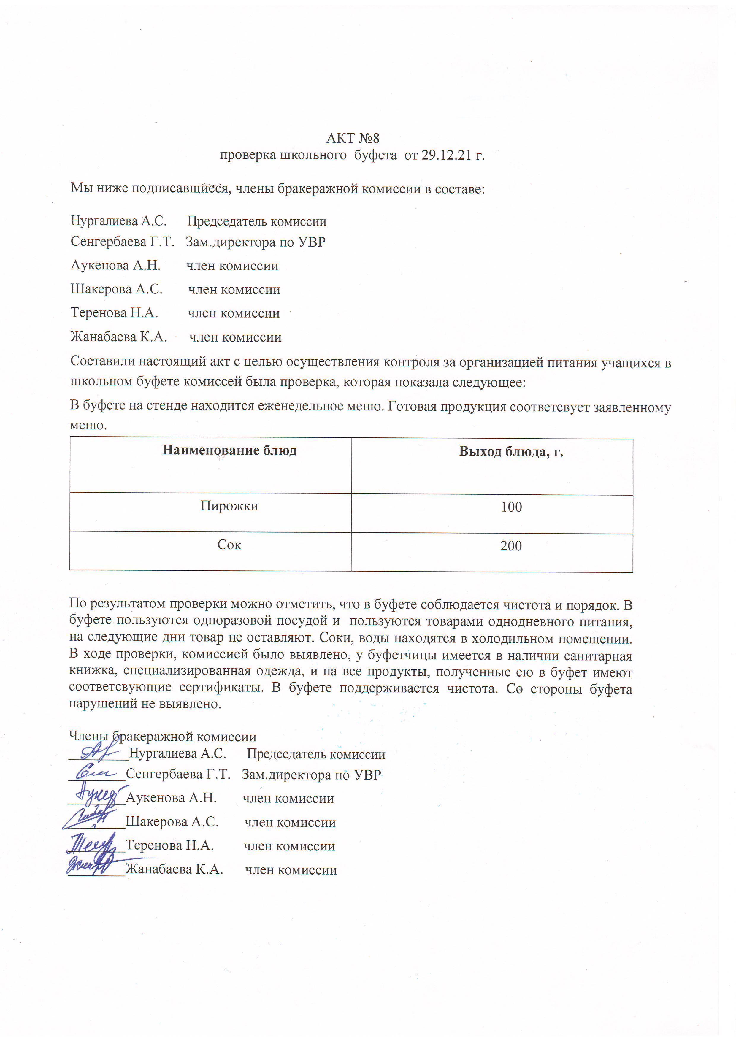 » Акт №8 проверки школьной столовой от 29.12.2021 г.
