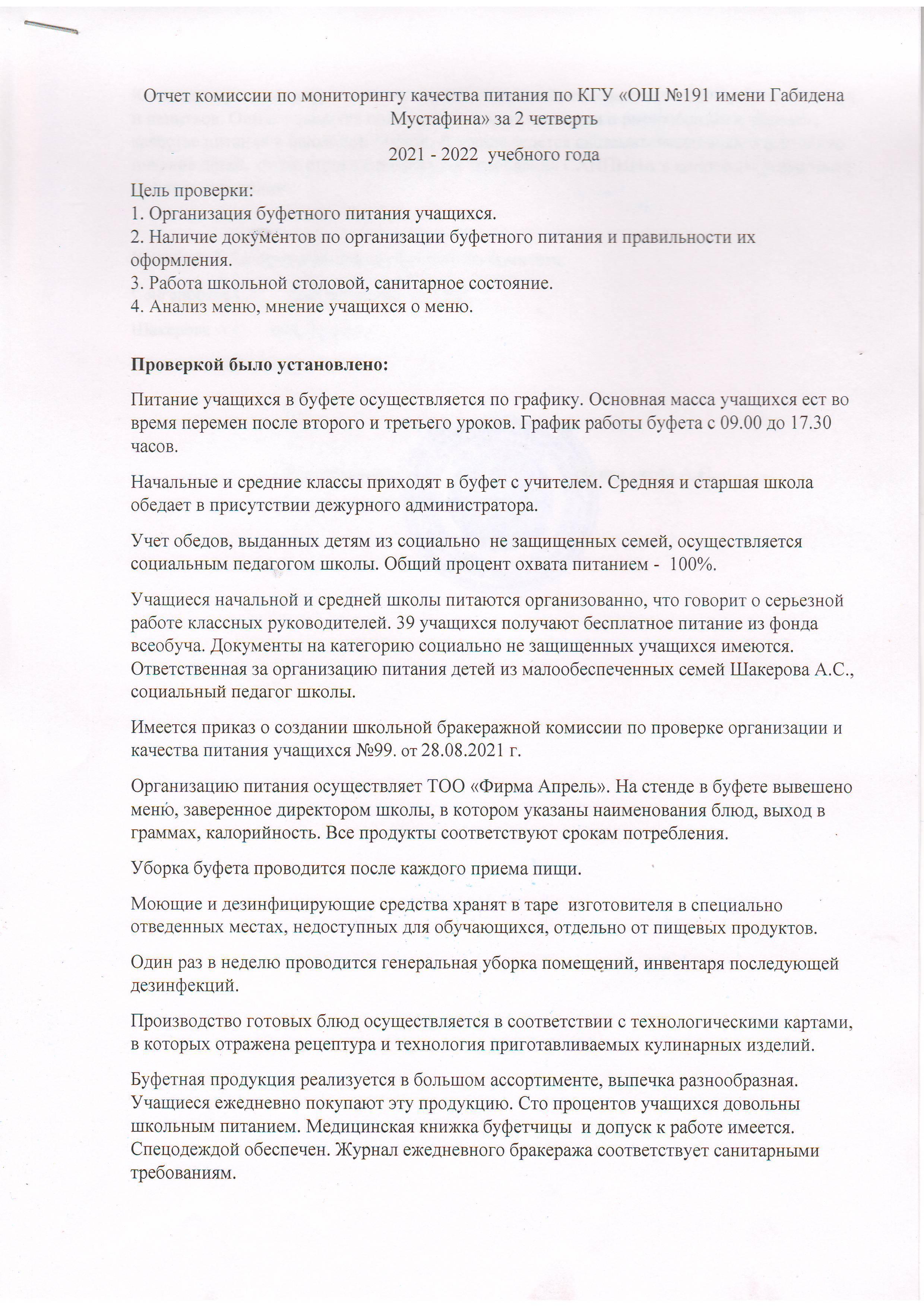 Отчет комиссии по мониторингу качества питания за 2 четверть