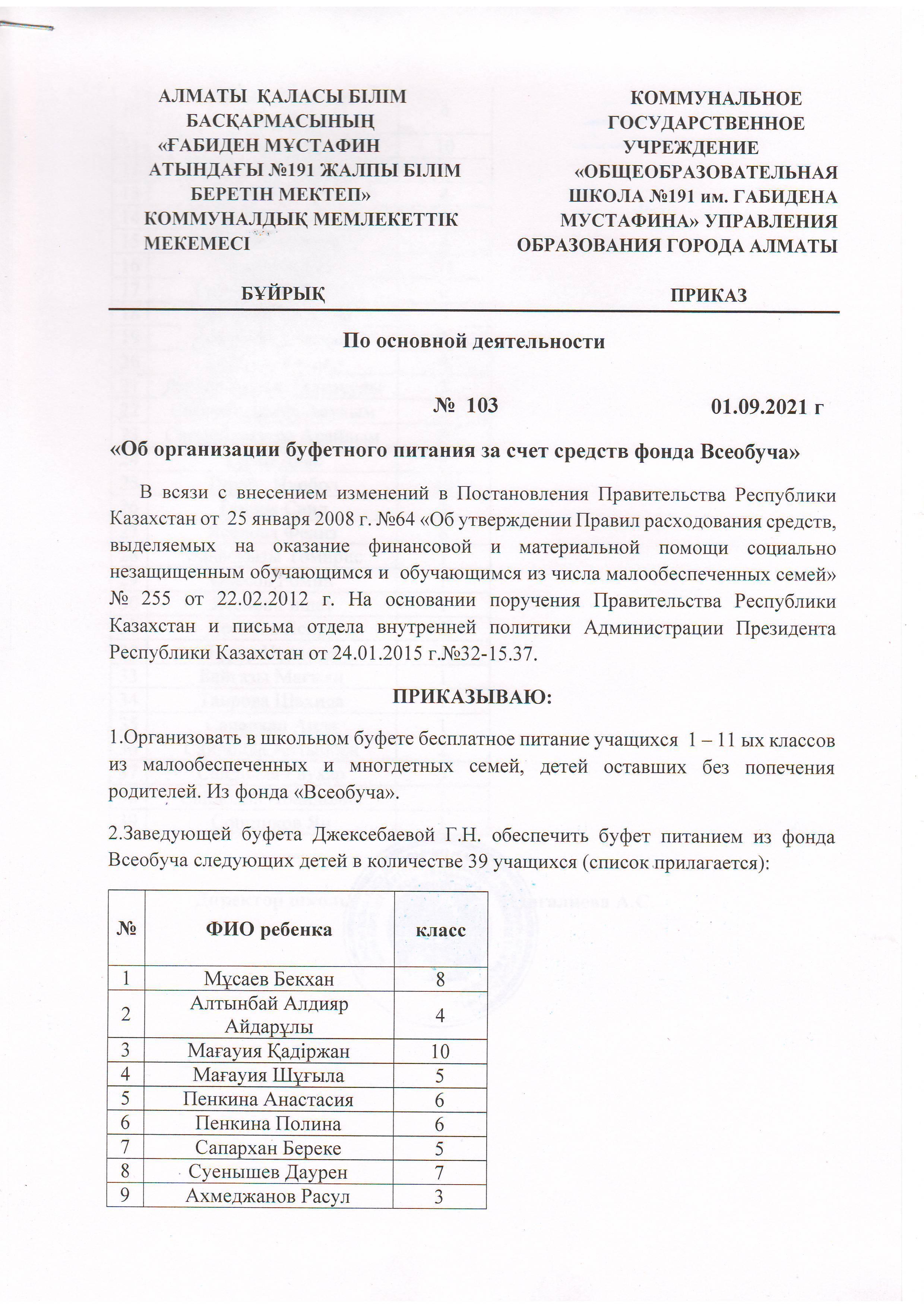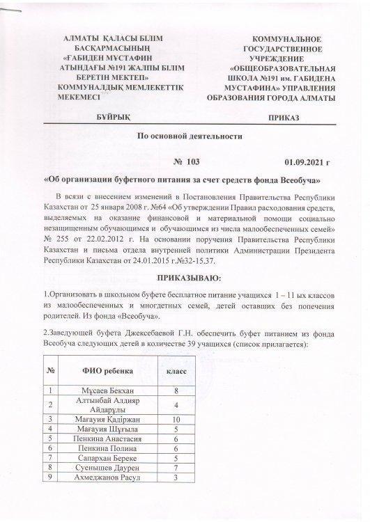 01 сентябрь 2021 0 1 2 3 4 5 Приказ "Об организации буфетного питания за счет средств фонда Всеобуча".
