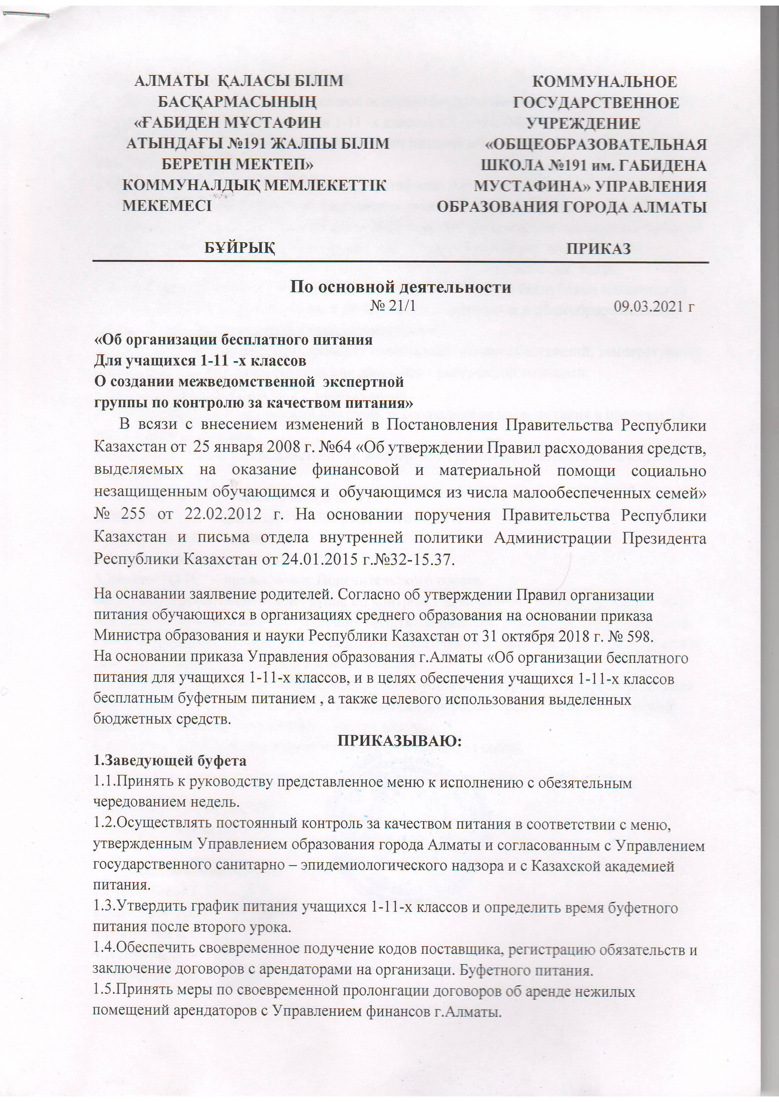 Приказ №21.Об организации бесплатного питания учащихся 1 - 11-х кл.