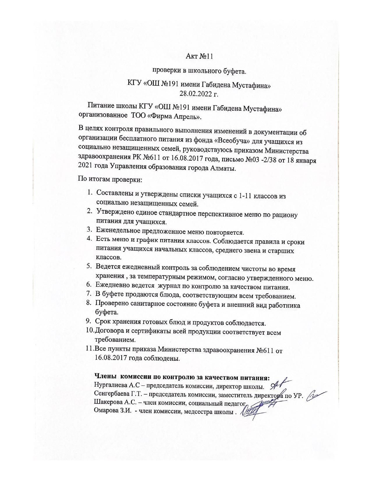 АКТ №11 28.02.2022 г проверки школьного буфета