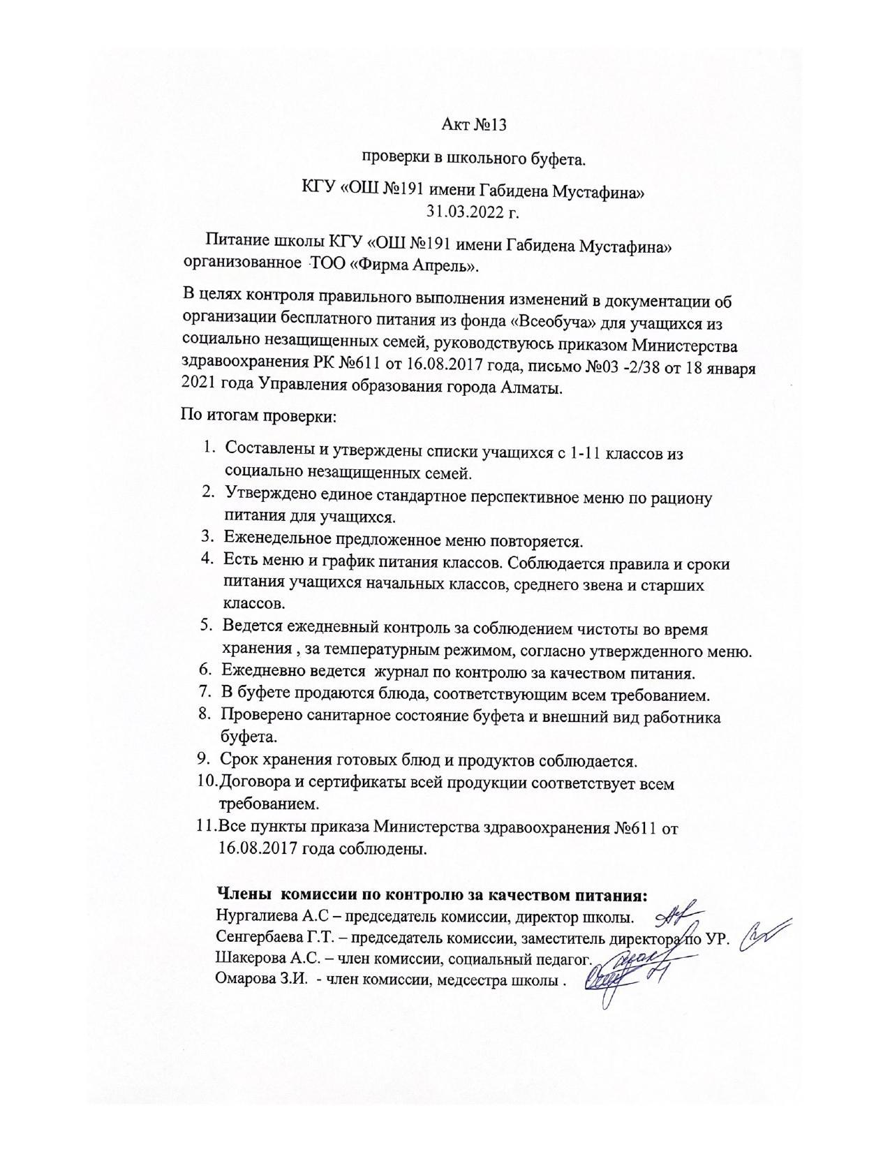 » АКТ № 13 31.03.2022 г проверки школьного буфета