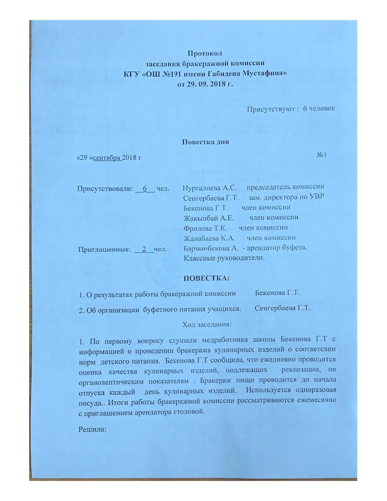 Протокол заседания комиссии по мониторингу за качеством питания