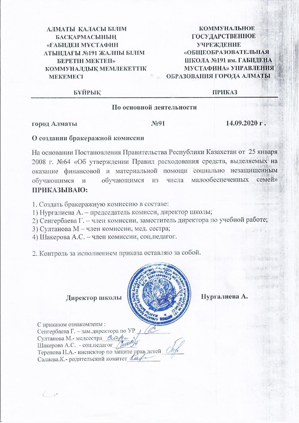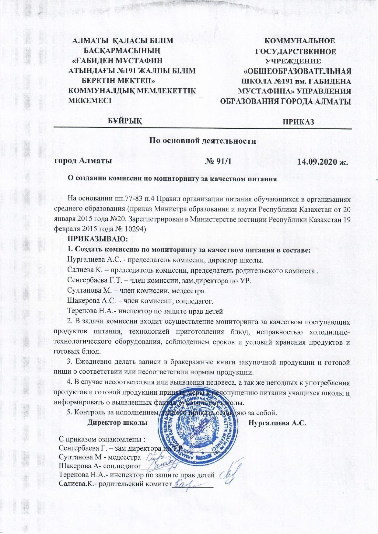 14 сентябрь 2020 0 1 2 3 4 5 О создании комиссии по мониторингу за качеством питания 2020 - 2021 учебный год.