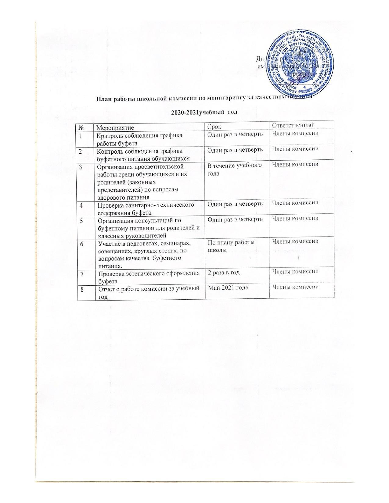 » План работы бракеражной комиссии 2020 - 2021 учебный год